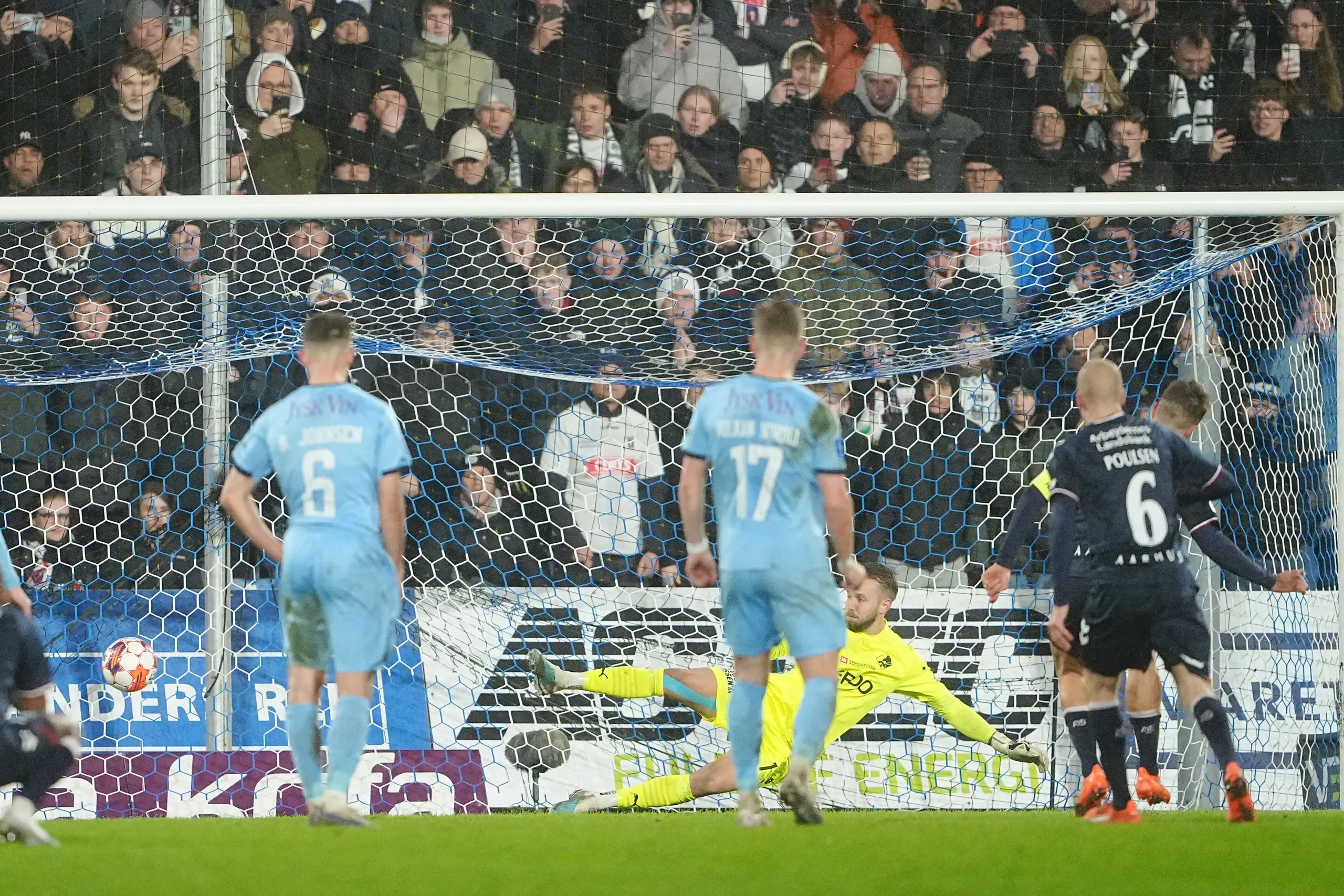 Men det gjorde den så alligevel efter seks minutter. For Patrick Mortensen blev ulovligt nedlagt i feltet. Straffespark til gæsterne. Og her er Mortensen som bekendt sikkerheden selv. Så nu var vi foran med to. Slet ikke ufortjent med en fin århusiansk indledning på anden omgang.