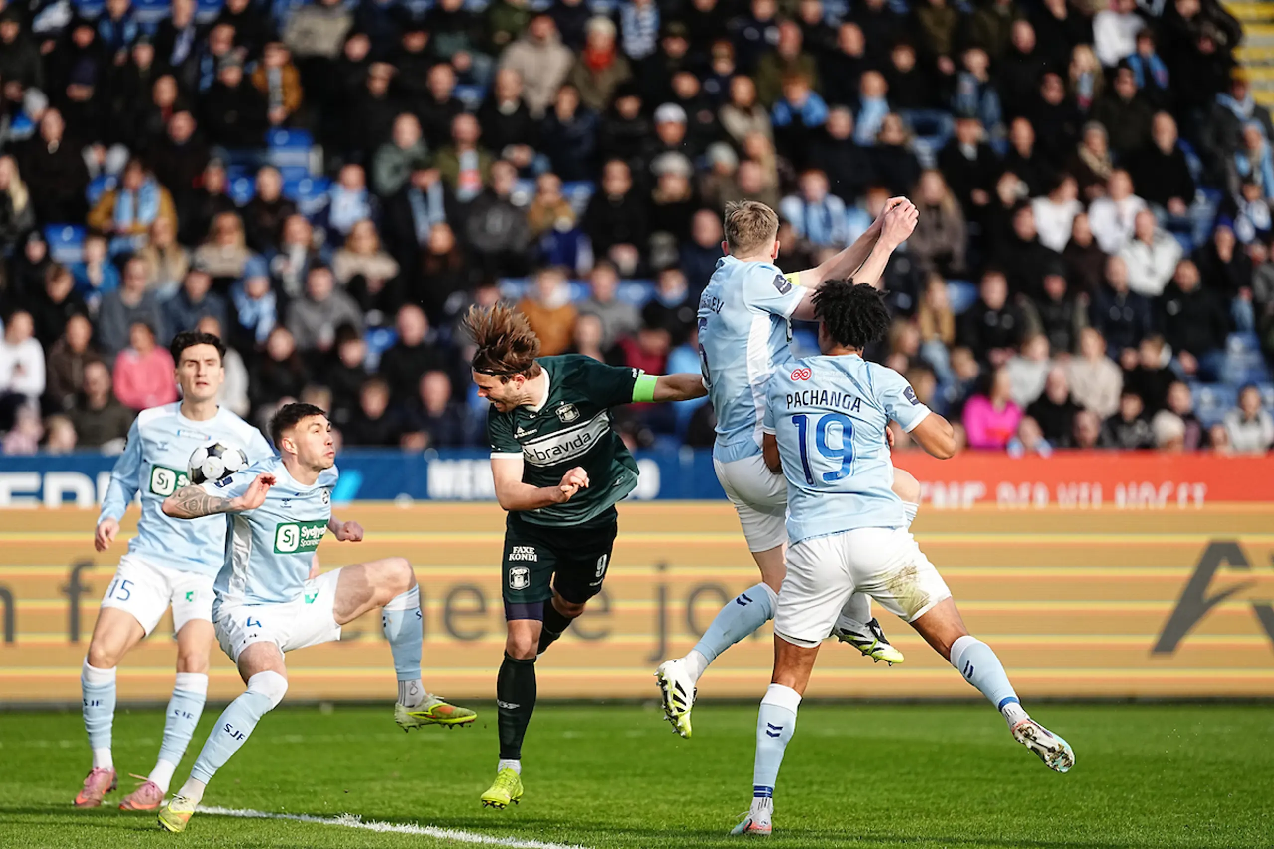 Som da Tobias Bech kom til en god afslutning med sit venstreben, men igen fik en lyseblå forsvarsspiller kastede sig ned i bolden.